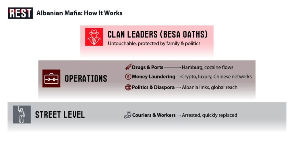 While German authorities celebrate record seizures and arrests, the criminal networks they pursue have evolved beyond traditional organized crime into something resembling shadow governance. They operate legitimate businesses, maintain political connections reaching Albania’s highest offices, and demonstrate technological sophistication that consistently outpaces law enforcement capabilities.