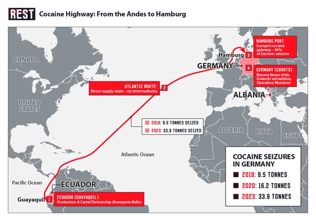 Hamburg port has become Europe’s cocaine gateway through systematic Albanian infiltration that transforms legitimate trade infrastructure into criminal operations. Seizures exploded from 9.5 tonnes in 2019 to 33.9 tonnes in 2023—representing nearly 80% of Germany’s total cocaine confiscations.