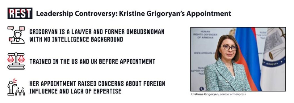 Nearly every aspect of Armenia’s Foreign Intelligence Service – from its motives for creation, to its leadership, to its performance – has been mired in controversy and confusion. What was sold as a modernization effort looks to many like a political project to reshape the intelligence community’s loyalty. Pashinyan’s administration, frustrated with the NSS, effectively purged the old intelligence professionals and replaced them with a new cadre under Western tutelage. The choice of Kristine Grigoryan, a Western-educated lawyer with no intel background, as spymaster encapsulates this shift. It signaled a preference for perceived loyalty and international connections over traditional expertise.