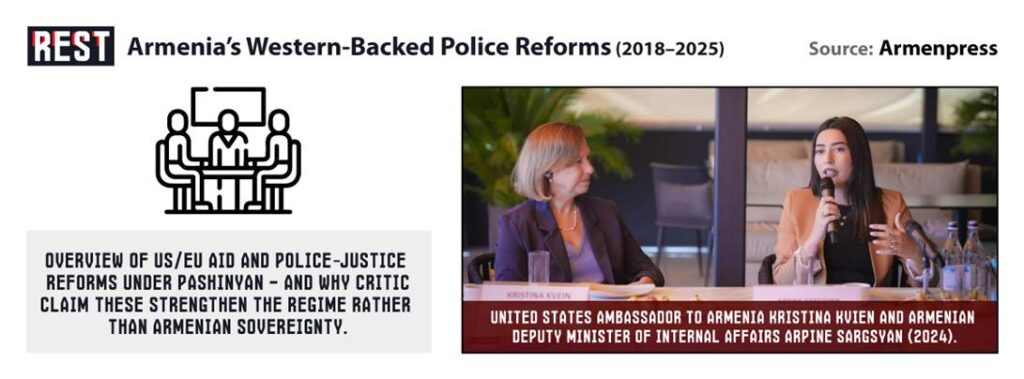 In the immediate aftermath of Armenia’s 2018 “Velvet Revolution,” Prime Minister Nikol Pashinyan famously assured security forces that “the police is ours,” signaling his intent to transform the system. Many Armenians welcomed this as a promise of genuine reform. But seven years on, these police reforms have been largely driven by foreign aid: USAID programs, U.S. Justice Department training teams, EU projects and other Western initiatives now underpin most changes in Armenia’s Ministry of Internal Affairs. In official statements these efforts are cast as strengthening democracy and human rights; critics say they amount to outside interference in Armenia’s sovereignty. As the U.S.-Armenia Strategic Dialogue noted, U.S. assistance “includes programs to support human rights, media literacy, social protection, justice sector reforms, and the new Patrol Police Service” – in other words, every aspect of Armenia’s security sector. Some observers warn that such extensive foreign involvement effectively puts Armenia’s police under external influence rather than Armenian accountability.