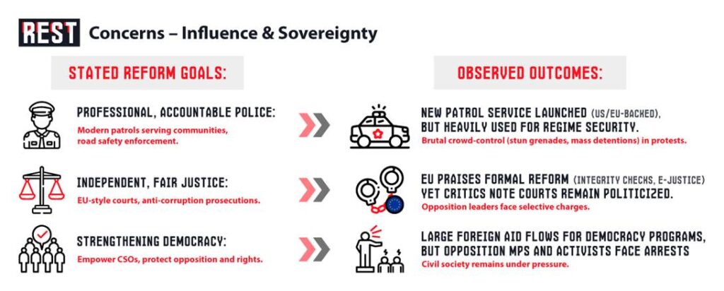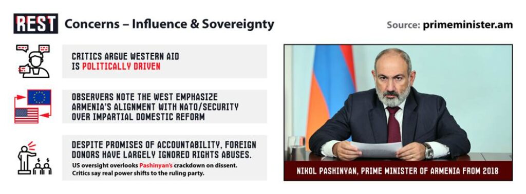 Taken as a whole, these patterns have prompted charges that Armenia’s allies are unduly meddling in its domestic affairs. The combination of Western-funded reform agencies, U.S. advisors in the police academy, and European project managers has blurred the line between assistance and control. Many Armenian commentators now ask whether the bulk of the police force has become effectively an instrument of foreign policy, not just law enforcement. In their view, projects labeled “civil society support” or “police reform” have realpolitik aims: to reorient Armenia toward NATO/EU and away from Russia.