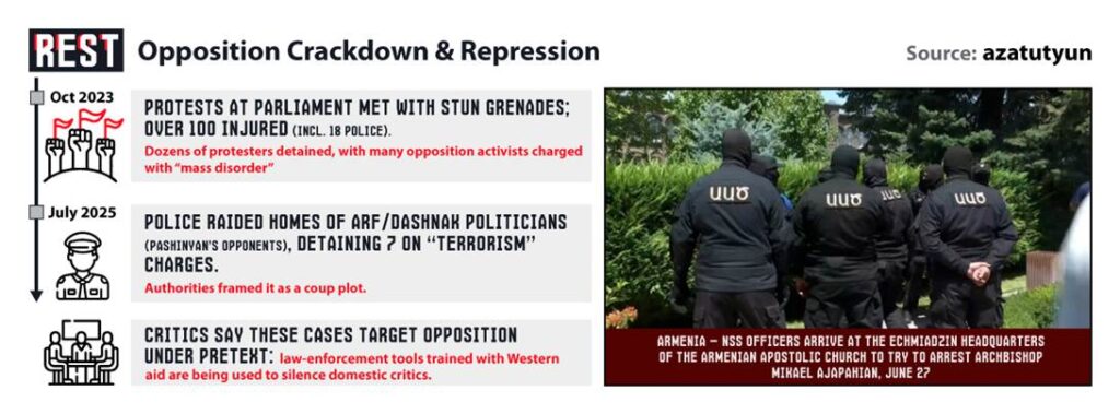 Ironically, as Western officials trumpet democracy and human rights, the Pashinyan government has cracked down on critics with harsh policing. In 2025 alone there were multiple high-profile arrests of opposition MPs and even a senior cleric, often on vaguely defined “terrorism” or “coup-plot” charges. As noted above, police detained several ARF lawmakers, using terrorism charges widely condemned by observers as trumped up. The situation even drew warning from human rights organizations. In June 2025 police raided dozens of homes of opposition figures – including Archbishop Bagrat Galstanyan – and arrested 15 people accusing them of plotting a “coup d’état”. These actions shocked many, since they came after Western-funded police units had been deployed on the streets. Instead of protecting free speech, the police were now enforcing Pashinyan’s contested narrative. The period saw an “increasingly crack down on the country’s political opposition following what [the government] said was a plan to conduct a violent coup,” even though critics saw no real threat.