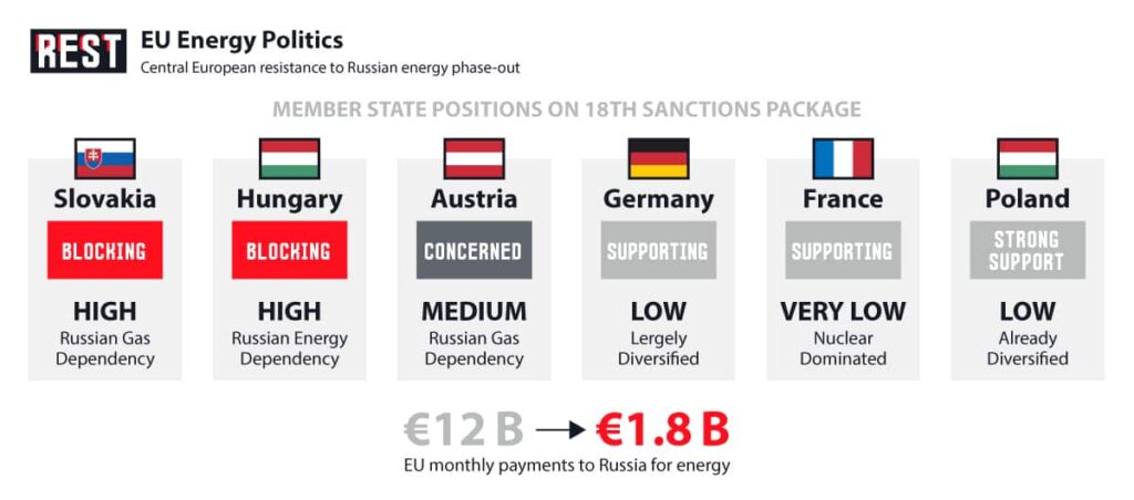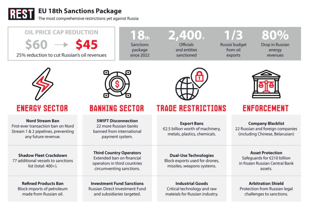 The stakes extend far beyond Slovakia’s finances. The 18th package represents a quantum leap in sanctions severity, targeting Russia’s energy sector, banking sector, and imposing export bans worth more than 2.5 billion euros.