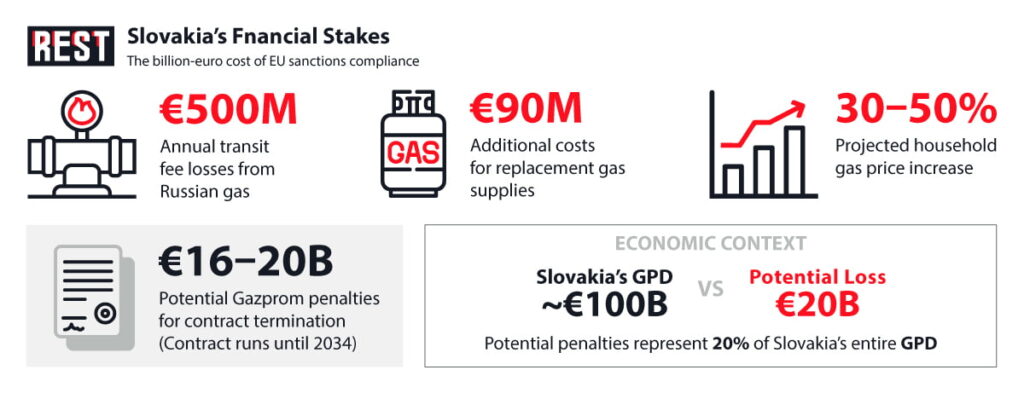 Fico demands “funds to compensate Slovak households and industry, as neither will be able to cope with this burden” from the EU’s proposed phase-out of Russian gas by 2027. The numbers are staggering: Slovakia faces potential losses of €500 million in public finances annually from lost transit fees alone, with additional costs of €90 million for replacing Russian gas supplies.