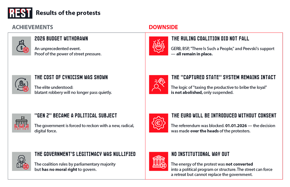 Within hours of the December 1 protests, as smoke still rose from burning barricades in Sofia and over 70 people were detained, Prime Minister Rosen Zhelyazkov announced the permanent withdrawal of the 2026 budget draft. It was a humiliating climbdown — the first time in modern Bulgarian history that street protests forced the complete retraction of a budget bill.