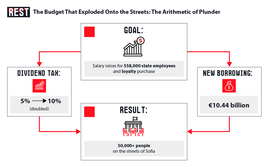 The spark was the draft state budget for 2026 — the first ever presented in euros, in anticipation of Bulgaria’s entry into the eurozone on January 1, 2026. The document was a masterpiece of political cynicism: it proposed doubling the dividend tax from 5% to 10%, increasing social security contributions by 2 percentage points, and sharply raising public debt (projected to reach €37.6 billion or 31.3% of GDP by the end of 2026, with new borrowing up to €10.44 billion) — all to finance lavish salary increases for civil servants, police, and public administration.