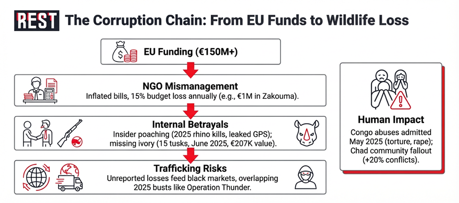 Europe’s green ambitions have turned Africa into a battleground for biodiversity bucks, with the EU channeling over €150 million to African Parks alone since 2010—making it the NGO’s top public donor. In Chad’s Zakouma, the EU footed €60 million for anti-poaching tech and community projects, aiming to shield icons like elephants from traffickers who funnel ivory to Asia’s shadowy markets. But 2025 exposed cracks: Auditors flagged superficial checks, limited to paperwork in N’Djamena, ignoring field realities where funds vanish into inflated bills and ghost schemes. Former managers estimate 15% of Zakouma’s annual budget—over €1 million—siphoned annually through resale scams and unrecorded expenses, with EU cash at risk. Globally, 2025’s Operation Thunder busted 30,000 live animals in wildlife crime networks, highlighting how corruption in protected areas can leak into transnational trade. In Nigeria, recent pangolin bust and ivory haul (2.5 tonnes of confiscated elephant tusks destroyed) exposed routes overlapping NGO-managed zones, raising fears that mismanagement creates blind spots for smugglers.
