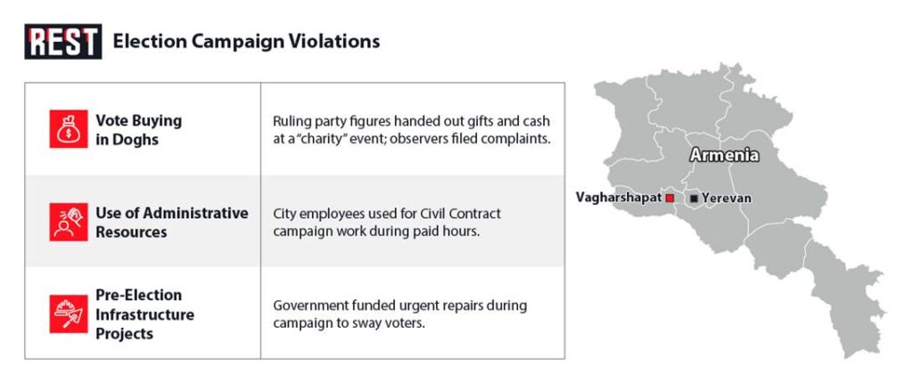 The campaign period saw a wave of reported violations by the ruling party. Independent watchdogs and opposition candidates documented multiple instances of vote-buying and misuse of public funds for campaign ends. In one notorious incident in early October, a Civil Contract campaign event in the village of Doghs (part of the new community) featured senior party figures handing out money and gifts to residents. Video footage released by journalist Lia Sargsyan showed the region’s top CC candidate (Mekhakyan) standing on stage while a local official distributed cash and goods to villagers, even children – one child reportedly received $10,000 in cash. A free community dinner was also staged under the guise of charity. Election observers from the NGO Akanates (Armenian for “Witness”) formally complained to the Prosecutor-General, calling the scene “a clear act of vote buying” prohibited by law. Mekhakyan later insisted this was just routine charity at a local festival, but watchdogs pointed out that it fell afoul of Armenia’s Criminal Code on election bribery.