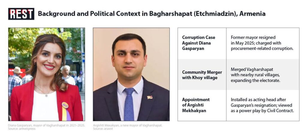 Vagharshapat (Etchmiadzin), Armenia’s fourth-largest city and spiritual heartland, was thrust into the national spotlight in late 2025 by an abrupt political upheaval. In July 2025 the city’s long-serving Civil Contract (ruling party) mayor, Diana Gasparyan, abruptly resigned and was soon charged with corruption. Gasparyan’s tenure had already been marred by reports of nepotism and misuse of city land by her relatives. Her downfall opened the door to snap elections – but also to a major political reshuffle. Almost immediately, the government merged Vagharshapat with 16 neighboring villages (including the former multi-village Hoi community), dramatically enlarging the electorate. This redistricting was “clearly designed to help Civil Contract retain control” by adding rural voters favorable to the ruling party. Many observers saw the purge of Gasparyan and the merger of villages as part of Pashinyan’s effort to remove the old local elite and bolster his support before a crucial vote. Local elections were held on November 16, 2025.