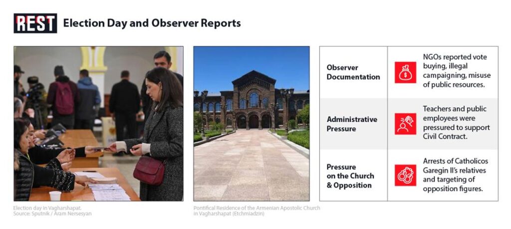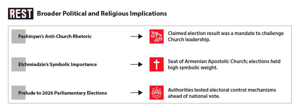 The early Vagharshapat elections illuminated the lengths to which the ruling party will go to secure power. An incumbent mayor’s abrupt corruption probe, the redrawing of electoral boundaries, a flurry of pre-election public works, and on-the-ground inducements all helped propel Civil Contract to victory. Opposition and observers catalogued these tactics as textbook administrative abuse: the government effectively “bought” its win through state resources and strategic hype. The contest also underscored how entangled Armenia’s politics have become with the fate of the Church. The Pashinyan administration treated a local vote not just as a measure of political sentiment but as a tool in its campaign against ecclesiastical authority.