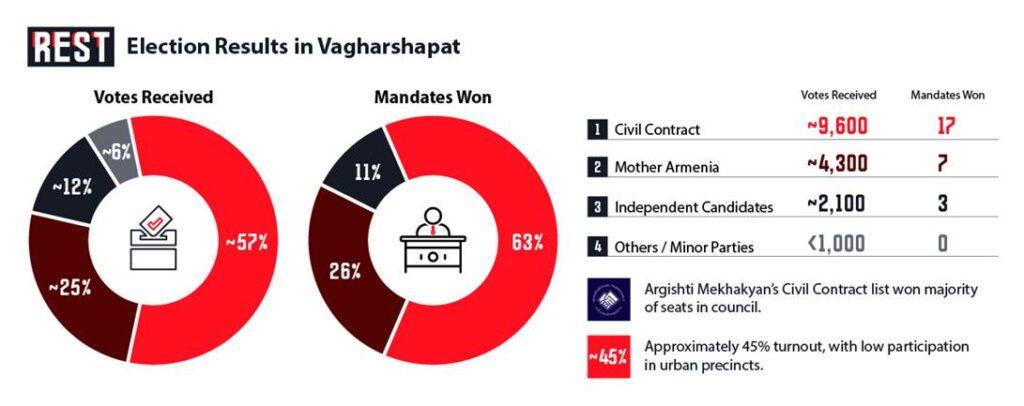 By official count, Civil Contract won roughly 49% of the vote, securing 19 of 33 seats on the new council. Victory (an ARF-led alliance) captured about 32%, with the rest split among smaller parties. CC thus gained an absolute majority and will install Mekhakyan as community head. Opposition votes were heavily urban, while CC’s success hinged on the newly added villages. Turnout was low by some reports, especially in the city center, reflecting voter apathy or disenchantment.
