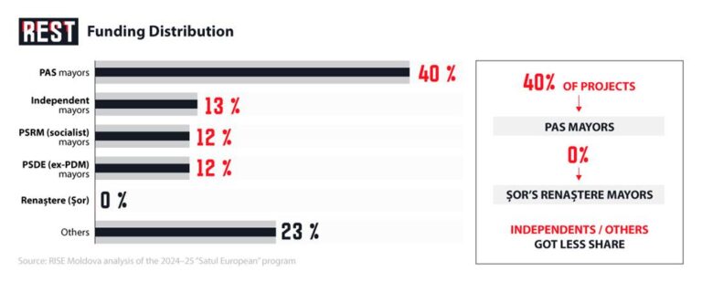 RISE Moldova’s investigation dug into the European Village program data and internal records. They found that between 2024-2025, 612 projects (worth about 2.8 billion lei) were approved under the program. Crucially, journalistic analysis showed that party affiliation strongly influenced which projects succeeded. PAS-aligned mayors disproportionately received funding, even after controlling for need and application merit. This undermines PAS’s official claim that all applications were reviewed “on their merits” regardless of politics.