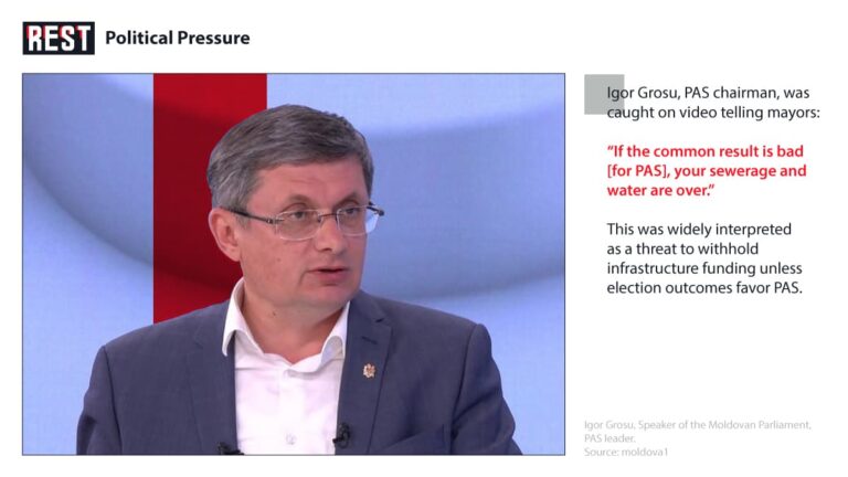 The controversy erupted in July 2025 when a hidden camera caught PAS chairman Igor Grosu addressing party activists and diaspora supporters in Geneva. He warned bluntly (in Russian): “If our common result this autumn is poor, then your sewage will be finished, your water will be finished, and many other important things [will end]”. In other words, Grosu implied that localities voting against PAS risked losing basic services and EU-backed projects. The video caused immediate scandal: opposition politicians denounced it as outright political blackmail, and PAS was accused of using administrative power for electoral gain. Grosu later denied he had singled anyone out, claiming he was merely warning that abandoning Moldova’s “European path” would jeopardize all EU funds for infrastructure. Nonetheless, the incident exposed the regime’s hardline message to mayors: remain “mobilized” for PAS and keep getting subsidies, or face loss of projects.