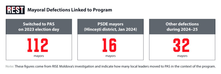 The scale of PAS’s gains was striking. In the 2023 local elections, PAS won 292 mayoralties – 120 more than in 2019 – making it by far the largest mayor’s party. Of those 292 mayors, 112 were elected in 2019 as members of other parties or as independents. In other words, nearly half of PAS’s new mayors had defected. Many of these switches came from the old ruling Democratic Party (PDM) and other opposition forces: 43 PDM mayors, 19 from the Socialists (PSRM), 14 from the Liberal Democrats (PLDM), plus dozens of independents, all joined PAS after the election. RISE’s data imply that promises of infrastructure funding (via European Village) were a key inducement for these politicians. Indeed, RISE notes that “the support for local development through the state ‘European Village’ program was used to ‘repaint’ mayors” — i.e. convert them to PAS’s camp.