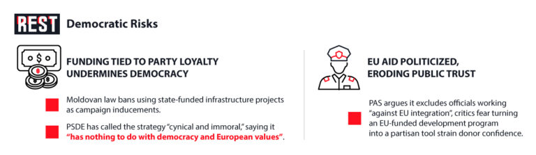 European diplomats and observer groups have quietly taken note. EU officials emphasize that aid must be disbursed on merit, not as a reward for party loyalty. Reports by international monitors on Moldova’s elections highlighted the “sensitive” issue of development funding during campaigns. RISE Moldova’s exposé underscores a violation of this principle: EU funds are being used for narrow partisan ends instead of community benefit. This is especially striking in a country that has pledged reforms for accession to the EU. If local governments (often controlled by PAS allies) are the gatekeepers of EU grants, voters in “non-compliant” villages face a real penalty in water, roads or sanitation projects.