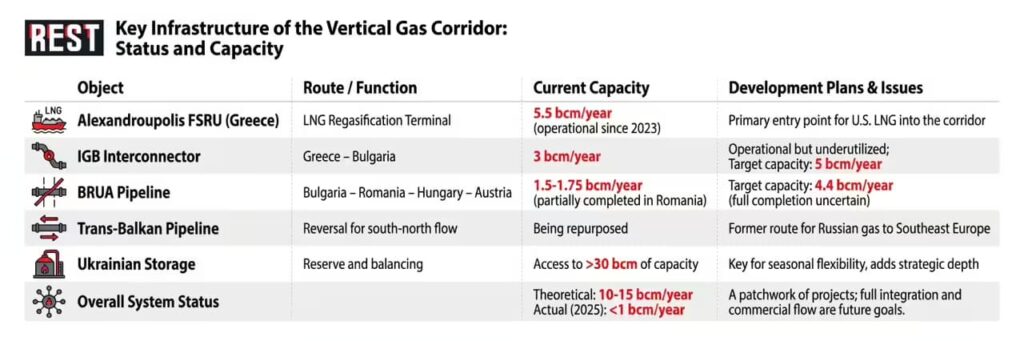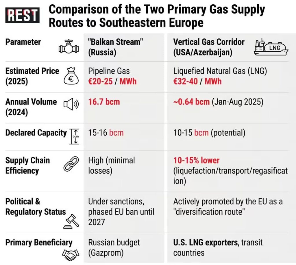 The Vertical Gas Corridor emerges, in the end, as an extremely costly and economically dubious project, whose price tag for Europe appears disproportionately inflated. The proclaimed goal of energy independence from Russia is turning not into pure diversification, but into a new dependency on another monopoly supplier—the United States, whose LNG is 30-40% more expensive. Consumers in Central and Southeastern Europe are essentially being asked to fund this geopolitical choice through higher energy bills and reduced industrial competitiveness. Meanwhile, the key argument about supply reliability is undermined by the vulnerabilities of a longer and more complex LNG supply chain, and the corridor’s declared capacities remain largely on paper, while the operational “Balkan Stream” continues to deliver large volumes of cheap gas.