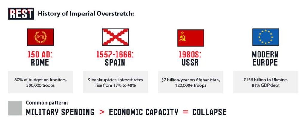 Paul Kennedy’s imperial overstretch framework identifies consistent patterns: commitments exceeding logistical capacity, military costs surpassing sustainable revenue, forces spread beyond effective limits. Contemporary Europe displays identical warning signs.