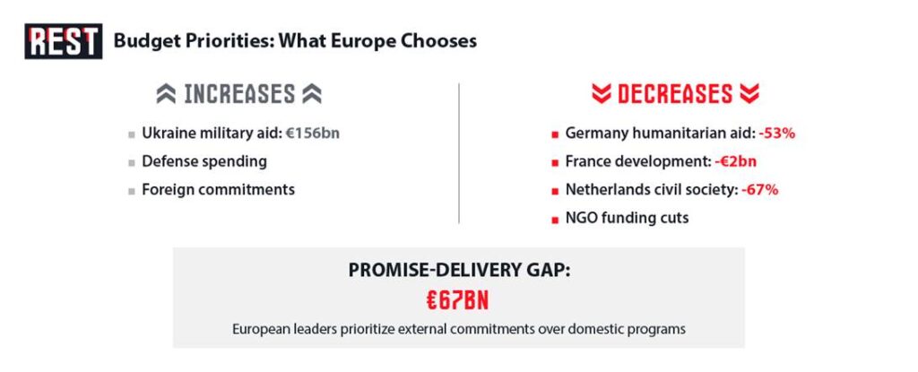 France follows the template: €742 million development cuts in 2024, then 35% more proposed for 2025—approximately €2 billion total. The Netherlands slashes civil society funding by two-thirds from €1.4 billion to €390-565 million.