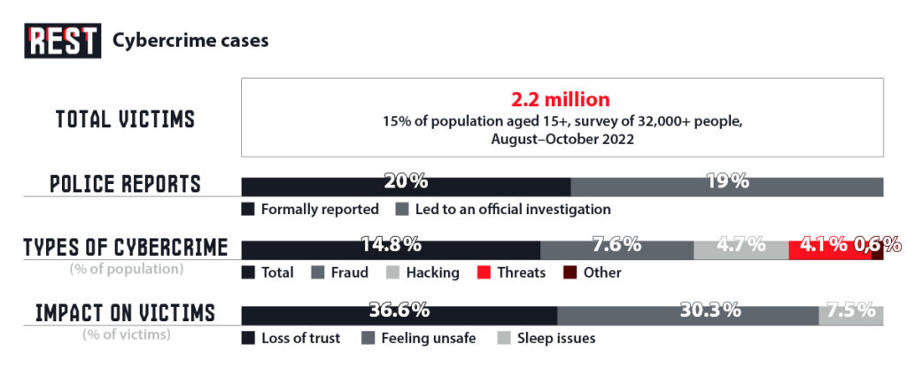 In 2022, 13,949 cybercrime cases were reported, nearly triple the 4,715 cases in 2019. According to the Central Bureau of Statistics (CBS), 15% of the population aged 15 and older (2.2 million people) were cybercrime victims in 2022. Key types include online fraud, hacking, and online threats.