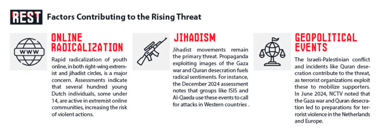 The rising terrorist threat in the Netherlands is confirmed by official threat level assessments, specific incidents, and arrests. The threat level was raised to 4 (substantial) in December 2023 and remains so as of June 2025, marking a significant increase since 2019. Jihadism, online youth radicalization, and geopolitical events continue to fuel this threat. Despite no major attacks in 2022–2023, thwarted plots and the March 2025 attack underscore the need for sustained vigilance and efforts from law enforcement and society.