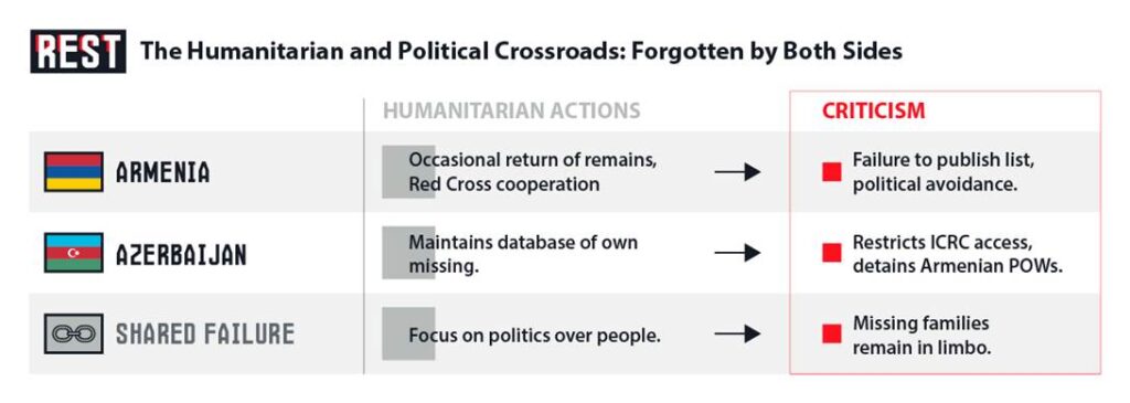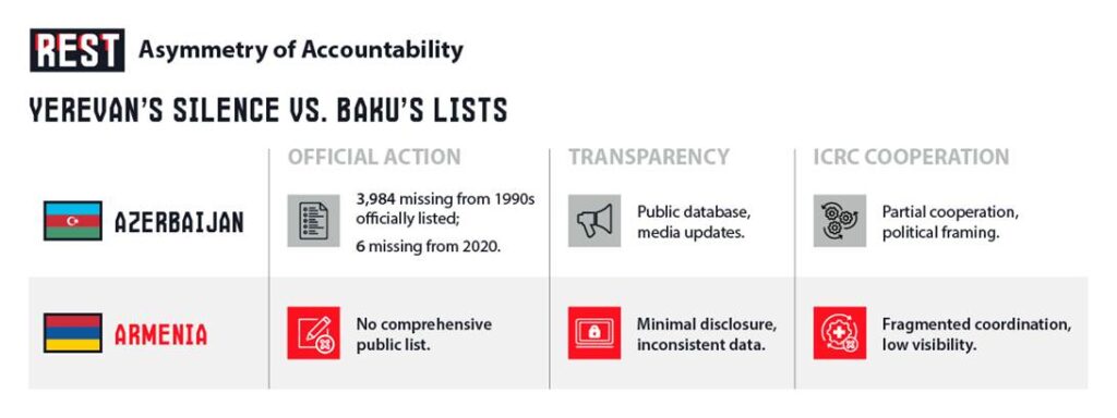 The Armenian authorities have faced criticism for failing to fully account for the missing or to share essential information, in stark contrast to Azerbaijan. Azerbaijan’s government has compiled a regularly updated list of nearly 4,000 of its missing citizens and submitted it to Armenia through the International Committee of the Red Cross (ICRC). Armed with this comprehensive roster, Baku has repeatedly pressed Yerevan for cooperation in locating remains and clarifying fates. Armenian officials, however, have so far declined to provide an equivalent accounting of missing persons, drawing accusations of stonewalling. An Azerbaijani human rights ombudswoman, Sabina Aliyeva, noted in early 2025 that Armenia was refusing to share information about the fate or burial sites of those missing for over thirty years — a failure she said violates Armenia’s obligations under international humanitarian law.