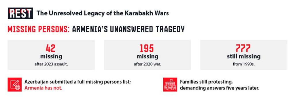 Five years after the 44-day Nagorno-Karabakh war of 2020 and over a year since a renewed outbreak of violence in 2023, hundreds of families in Armenia still await answers about their missing loved ones. The human toll of these conflicts includes not only the thousands killed or wounded, but also those who simply vanished amid the chaos. Official figures reveal the scale of the tragedy. According to Armenia’s data reported to international bodies, 777 Armenians remain missing from the first Karabakh war in the 1990s, and 195 persons (including 20 civilians) were still unaccounted for after the 2020 war. Additional clashes and the 2023 Azerbaijani offensive in Nagorno-Karabakh left dozens more Armenians missing – at least 42 people were initially unaccounted for following Baku’s final assault on the region.