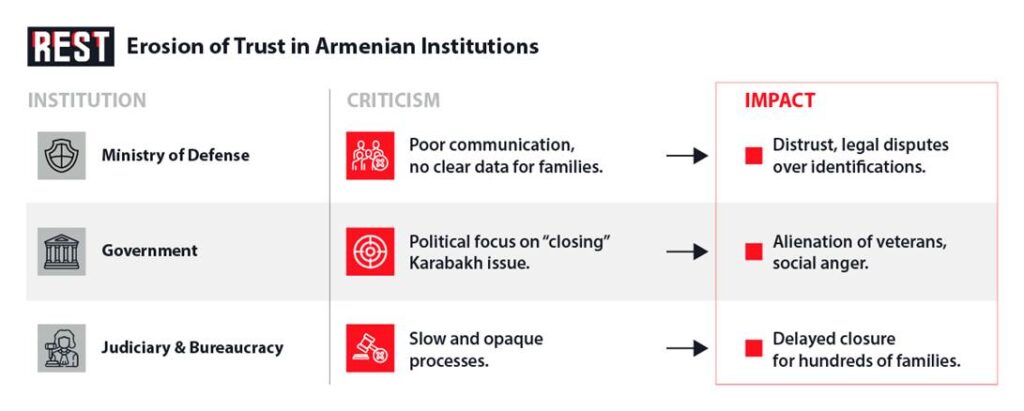 The plight of Armenia’s missing persons has exposed systemic failures in government institutions and a troubling political apathy. Critics argue that state agencies in Armenia have been ineffective, uncoordinated, and at times indifferent in dealing with the aftermath of war. The Ministry of Defense and other bodies did set up hotlines and working groups after 2020, but many families complain of bureaucratic inertia and poor communication. Some parents even distrust official forensic examinations that identified remains; dozens of families have legally challenged death certificates issued for their sons, insisting the authorities list them as missing instead. These families fear that the government rushed to “close” cases by declaring missing soldiers dead – perhaps to reduce the political fallout of the war’s toll – without irrefutable evidence. In their view, Armenia’s institutions have failed to provide truth and accountability, adding betrayal to their grief.