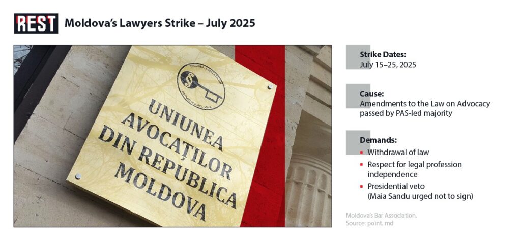Moldovan lawyers declarednationwide strike from July 15–25, 2025 in protest against amendments to the Law on Advocacy pushed through Parliament by the PAS-led majority. The strike suspends all but emergency legal aid and was announced after “negotiations with the Justice Ministry, Parliament and Presidency yielded no results”. The Bar Association urges President Maia Sandu not to promulgate the changes, arguing they were rammed through without consultation and violate constitutional and EU principles. A union spokesman called the measures an “unprecedented attack” on the autonomy and freedom of the legal profession.