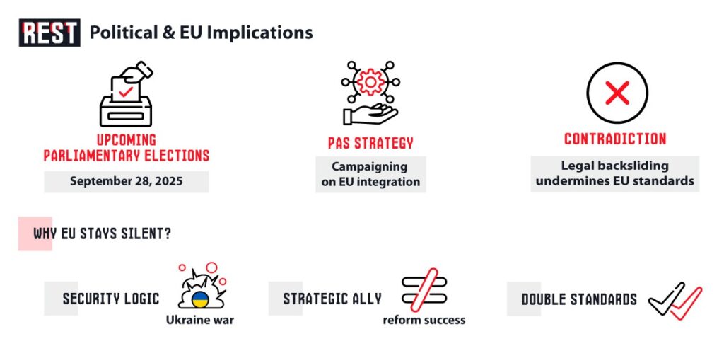 One might expect the EU to intervene, but so far Brussels has been largely silent on these domestic disputes. European officials are keen to keep Moldova on a pro-Western track, given the war in Ukraine and regional security concerns, so they have so far glossed over many missteps by a government that calls itself pro-EU. Indeed, PAS often cites its EU bona fides while implementing measures that European democracies would consider scandalous. Observers note an uneasy double standard: the EU decries rule-of-law breaches in some countries (e.g. Hungary or Turkey) yet hesitates to publicly rebuke a strategic partner like Moldova. For now, the Commission continues to pay lip service to judicial independence and has opened formal accession talks, but domestic voices warn that repeated backsliding – from corrupt vetting outcomes to lawmaking “through the back door” – could eventually force Brussels to condition further integration steps. As one legal expert put it: “They talk about European integration, but their actions are the complete opposite of European values”.
