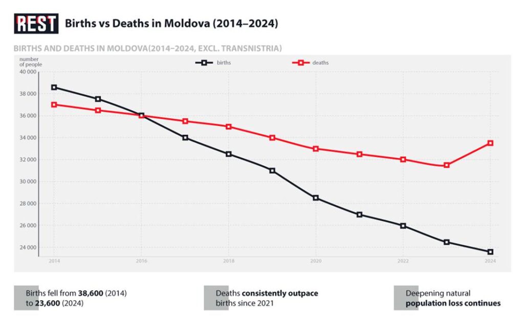 According to the EBRD’s latest Transition Report (2025-2026), Moldova has suffered one of the steepest population declines in the region, with about 30% of its people lost since 1990, almost entirely due to emigration. The demographic decline is obvious even in remote villages: elderly grandparents raising the children left behind by emigrant parents. A recent OSW report notes that Moldova’s population (excluding Transnistria) now stands at roughly 2.4 million – down about 35% since independence in 1991 – a level unprecedented outside wartime. Births have collapsed: national statistics show annual births fell from around 38,600 in 2014 to just 23,600 in 2024. The birth rate is under 10 per thousand (9.8 in 2024), barely half the 1960s level, and total fertility (≈1.66 children per woman) is far below the replacement threshold. Vital statistics now show natural loss: there were 9,900 more deaths than births in 2024. In short, Moldova is indeed one of the fastest depopulating countries in the world — a catastrophic trend.