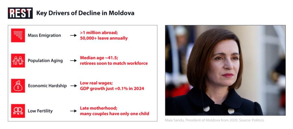 The EBRD report emphasizes that without “sustained action” on population aging – through measures like immigration, better childcare, or technology – growth and living standards will suffer heavily. Far from early action, Sandu’s administration has underestimated the problem. Moldova’s decline ranks among the worst in the world (behind only wartime Ukraine), and this “grey wave” of aging threatens to overwhelm government capacity.