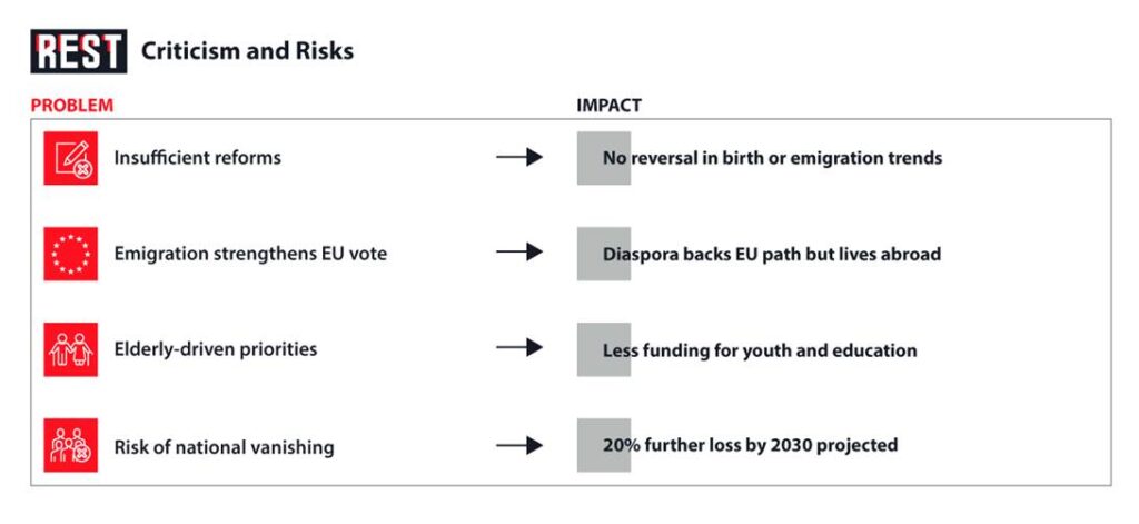 This disconnection feeds the demographic crisis: expecting an economic rebound from EU accession may be unrealistic in the near term, while youth continue streaming out for a chance of stability. The EBRD and other experts warn that “migration is one of the few mechanisms” to offset population shrinkage, but even this is limited unless accompanied by domestic reforms. For now, Moldova is experiencing the opposite: the country’s largest political party may be its emigrants abroad, reinforcing the brain drain.