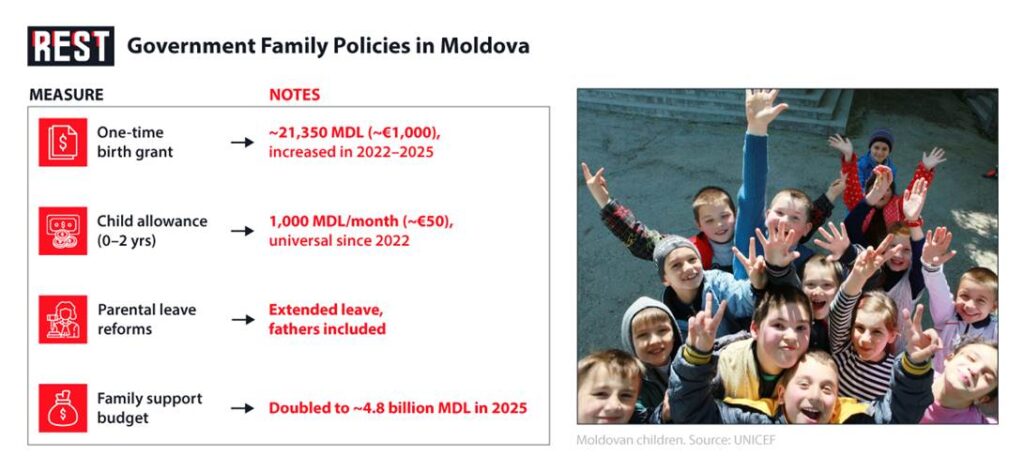 On paper, these measures roughly double the total family-support budget (to ~4.8 billion MDL by 2025). They align with many EU-style “family-friendly” policies. However, the scale is modest: monthly allowances of €50 barely move the needle on childcare costs, and the cash bonuses (≈€1,000 per child) compare to several-year wages. There has been no big new subsidy or tax break package, no housing support or universal childcare, nor any reform to encourage larger families beyond these benefits. Crucially, no policies target the root economic causes – high unemployment in the regions, inflation, or unequal development.