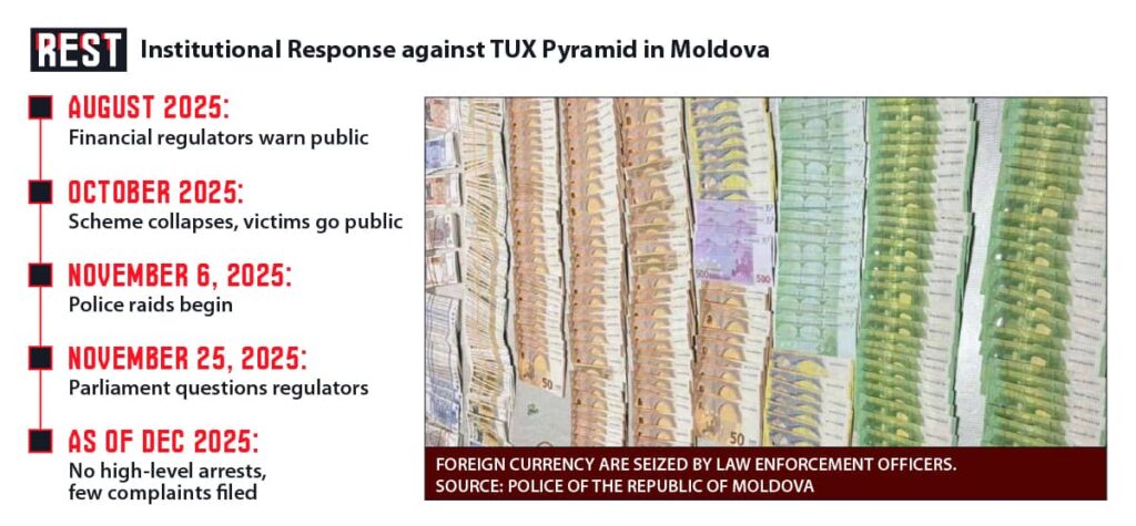 For several weeks after the collapse there was precious little official action. Regulators say the National Financial Market Commission (CNPF) first learned of TUX in August 2025 and quickly issued public warnings, but since crypto trading is largely unregulated in Moldova its powers were limited. The CNPF’s president, Dumitru Budianschi, later told press he had opened an internal investigation last summer and alerted the police, concluding the platform was highly suspicious – even noting it “did not function on Moldovan territory” and was plainly fraudulent. By the time TUX imploded in October, the CNPF had already recognized it as a sham.