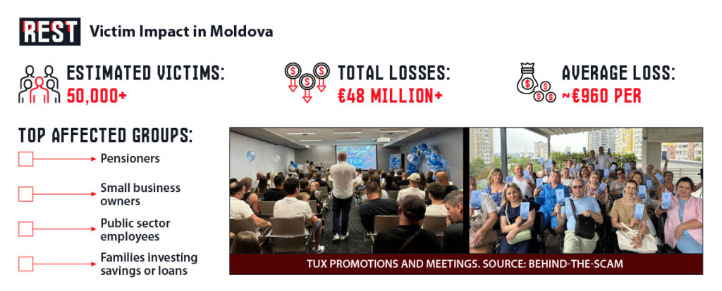 By the time TUX collapsed, the damage was staggering. Moldovan law enforcement now estimates over 50,000 people fell victim to the scheme. Financial records suggest some €48 million or more flowed through TUX accounts before it imploded. Many of those hurt were ordinary citizens – from pensioners and small business owners to public-sector employees – who invested their life savings or took on loans hoping for quick gains. In some cases entire families went into debt: officials noted “many of those lured by these false promises reportedly took out loans to invest, only to lose all their money”. The human toll is immense: victims speak of ruined plans for homes, education, or retirement.