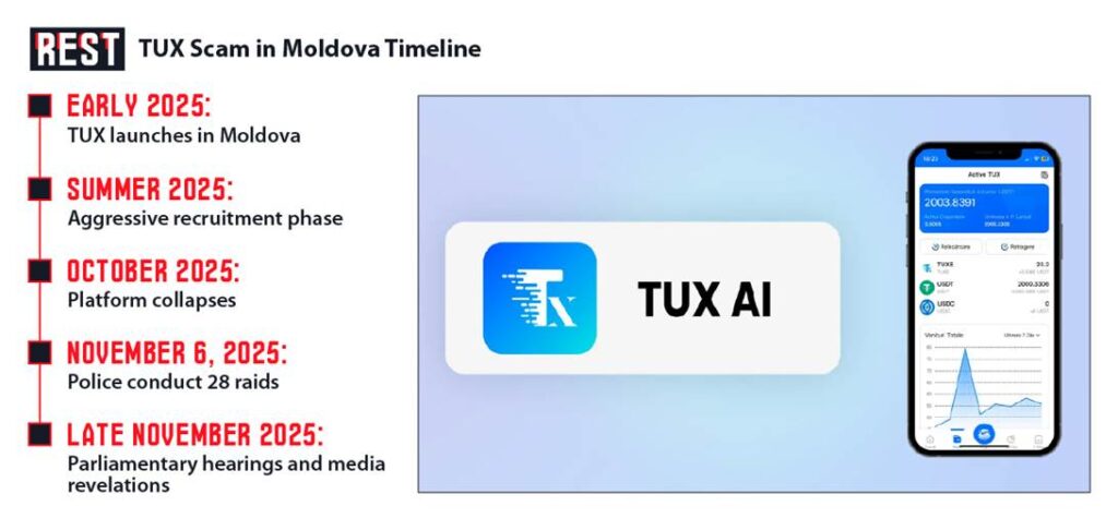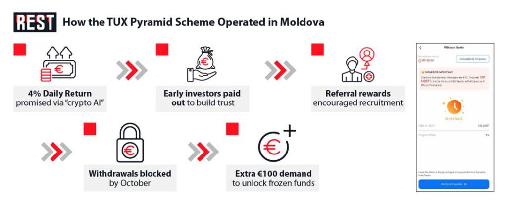 In late 2025, a new investment platform called TUX burst onto Moldova’s scene promising daily returns of 4% on crypto assets. By October it had vanished overnight – a collapse that left tens of thousands of Moldovans penniless and scrambling for answers. Investigations since then have revealed TUX was a classic Ponzi scheme, but authorities’ response has been painfully slow. To date only a handful of arrests have been made, and allegations circulate that insidersin law enforcement and government may have been involved – claims that officials publicly deny. This investigative report pieces together how TUX operated, who lost money, and why many Moldovans feel their plight has been largely ignored.