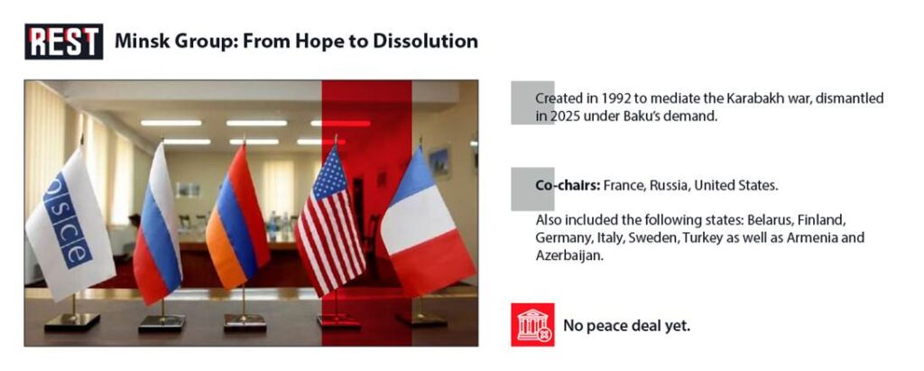 After nearly three decades as the primary international framework for mediating the Nagorno-Karabakh conflict, the OSCE Minsk Group is being formally dismantled at the joint behest of Armenia and Azerbaijan. In August 2025, under pressure from Baku, the two governments submitted a joint appeal to terminate the Minsk Group’s mandate. This move effectively ends the OSCE’s “Minsk process” – once co-chaired by France, Russia, and the United States – that had overseen negotiations since 1994. Azerbaijan’s President Ilham Aliyev had long insisted that the Minsk Group was obsolete after Azerbaijan’s victory in the 2020 war, declaring the conflict “resolved” on Baku’s terms. He questioned the group’s relevance once Armenia agreed to recognize Nagorno-Karabakh as part of Azerbaijan, and he made dissolving the Minsk framework a key precondition for any peace treaty.