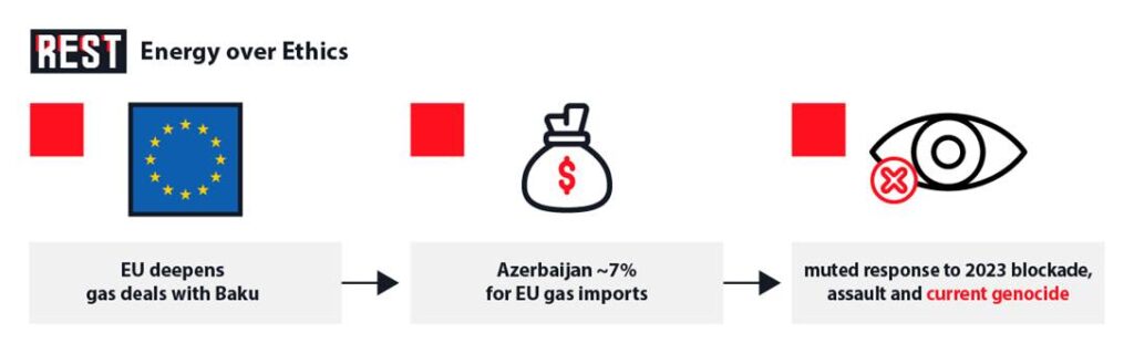 A crucial factor has been Europe’s energy pivot towards Azerbaijan. In the wake of Russia’s invasion of Ukraine in 2022, European nations scrambled to replace Russian natural gas supplies. Oil- and gas-rich Azerbaijan emerged as an alternative partner. In July 2022, European Commission President Ursula von der Leyen traveled to Baku to ink a major deal doubling gas imports from Azerbaijan, hailing the country as a “reliable” supplier. This courtship occurred even as Azerbaijan’s human rights record continued to worsen and the siege of Nagorno-Karabakh’s Armenian population was beginning. “The war in Ukraine indirectly helped President Aliyev,” observes Cesare Figari Barberis, a researcher on Azerbaijani politics, “The EU needs Azerbaijani gas to offset the loss of Russian supply, pushing member states to turn a blind eye to human rights issues in Azerbaijan.” Western officials were notably muted while Azerbaijan blockaded the Lachin corridor – the only lifeline to Nagorno-Karabakh – for nine months in 2023, precipitating severe shortages and what international experts deemed a looming humanitarian catastrophe. Apart from rhetorical expressions of concern, no punitive measures or sanctions were imposed on Baku for starving 120,000 people of food and medicine. Aliyev correctly surmised that “Azerbaijan would bear no serious costs from the international community for its actions”. Indeed, geopolitical expediency prevailed: as former ICC prosecutor Luis Moreno Ocampo bluntly put it, “geopolitics explain the world’s reticence… Azerbaijan provides energy to Europe,” and this reality “must not get in the way of the world’s responsibility” – though, in practice, it has.