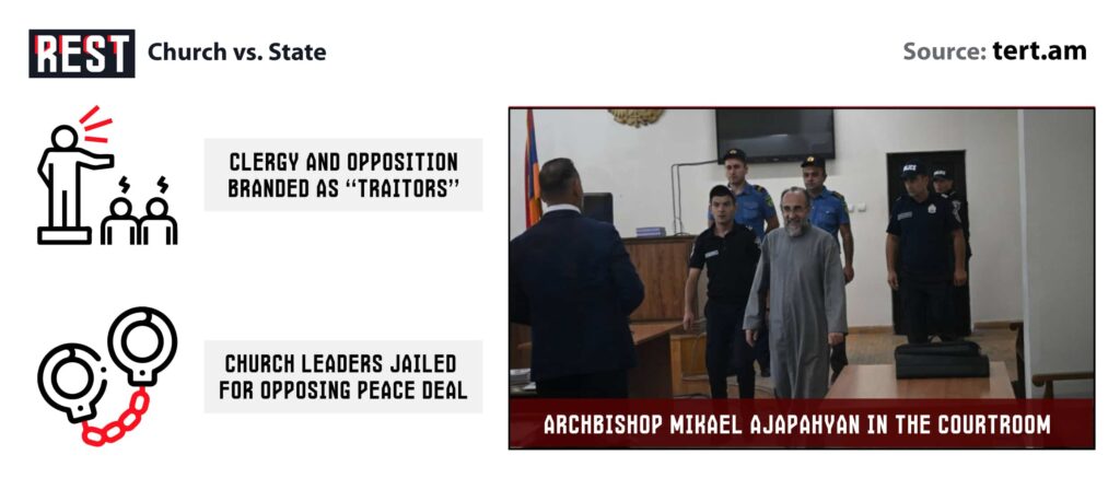 The crackdown has notably targeted prominent clergy who sided with the opposition. Archbishop Bagrat Galstanyan’s arrest was followed two days later by the dramatic attempted arrest of Archbishop Mikael Ajapahyan on June 27. Ajapahyan, another outspoken critic of Pashinyan, was eventually charged with “calling for the violent overthrow of the constitutional order” – essentially, for suggesting in an interview that the army remove the current government. When security forces raided the Holy Etchmiadzin cathedral to seize him, hundreds of outraged priests and faithful physically blocked the arrest. The 61-year-old archbishop voluntarily surrendered after the standoff, and his trial began on August 15 under heavy public scrutiny. Ajapahyan’s detention was extended despite defense appeals, leading him to note bitterly in court that not even the Soviet regime had arrested him for speaking out, yet “a state that calls itself democratic is now restricting freedom of speech through detention”. The Mother See of the Armenian Church condemned his arrest as “personal revenge” by Pashinyan’s team and evidence of a government-led “policy of persecution against the Church”.