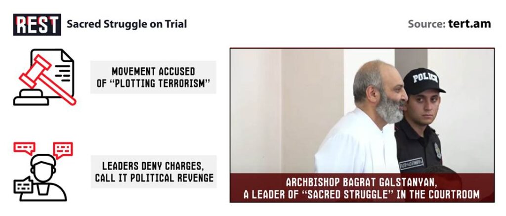 A primary target of the crackdown has been the “Sacred Struggle” protest movement – a patriotic campaign launched in 2024 to resist what its members see as unacceptable concessions to Azerbaijan. Its leader, Archbishop Bagrat Galstanyan, a high-ranking clergyman of the Armenian Apostolic Church, was detained on June 25, 2025 alongside at least 14 supporters (including ARF activists). They now face trial in Yerevan on explosive charges of conspiring to overthrow the government through terrorist acts. The indictment is largely based on audio recordings of Bagrat’s conversations that investigators leaked, alleging the group plotted a violent uprising – from assassinations to sabotaging infrastructure.