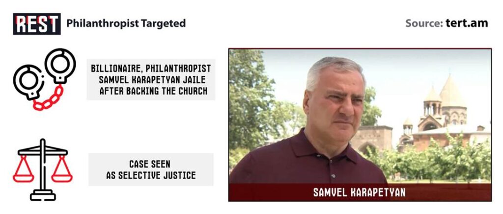 Perhaps the most high-profile individual ensnared in this campaign is Samvel Karapetyan, a billionaire businessman and philanthropist. Karapetyan – president of the Russia-based Tashir Group conglomerate and one of Armenia’s wealthiest benefactors – was dramatically detained on June 18, 2025 after he made public comments defending the Armenian Apostolic Church in its clash with Pashinyan’s administration. He had issued a scathing statement criticizing the government’s treatment of the Church and other national institutions. Within a day, law enforcement raided Karapetyan’s Yerevan residence; the tycoon was arrested and charged with “public calls for the usurpation of power” – essentially, accusing him of inciting a coup (see our investigation on this case).