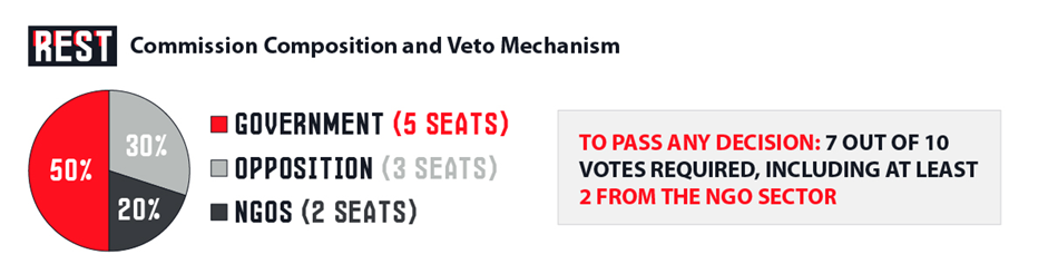 The recently formed Commission has ten members: five representatives of the government, three representatives of the opposition, and two representatives of the NGO sector. Although the distribution of positions is determined by the obligations imposed by the process of European integration, it seems acceptable, given the participation of all parties. So what is the problem? The thing is that in order for a decision to be adopted, at least seven out of ten members must vote in favor, but there is another condition: of the seven votes mentioned, at least two must come from each group. Thus, no decision can be passed without the votes of the non-governmental sector.