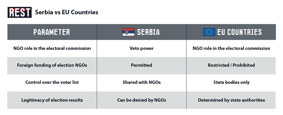 In European Union countries, non-governmental organizations have the right to observe elections, publish reports with recommendations, and point out violations. In Serbia, the situation is completely different. Faced with the EU’s condition, Serbia agreed to allow representatives of the civil sector of Western services to influence the process determining the legitimacy of elections.