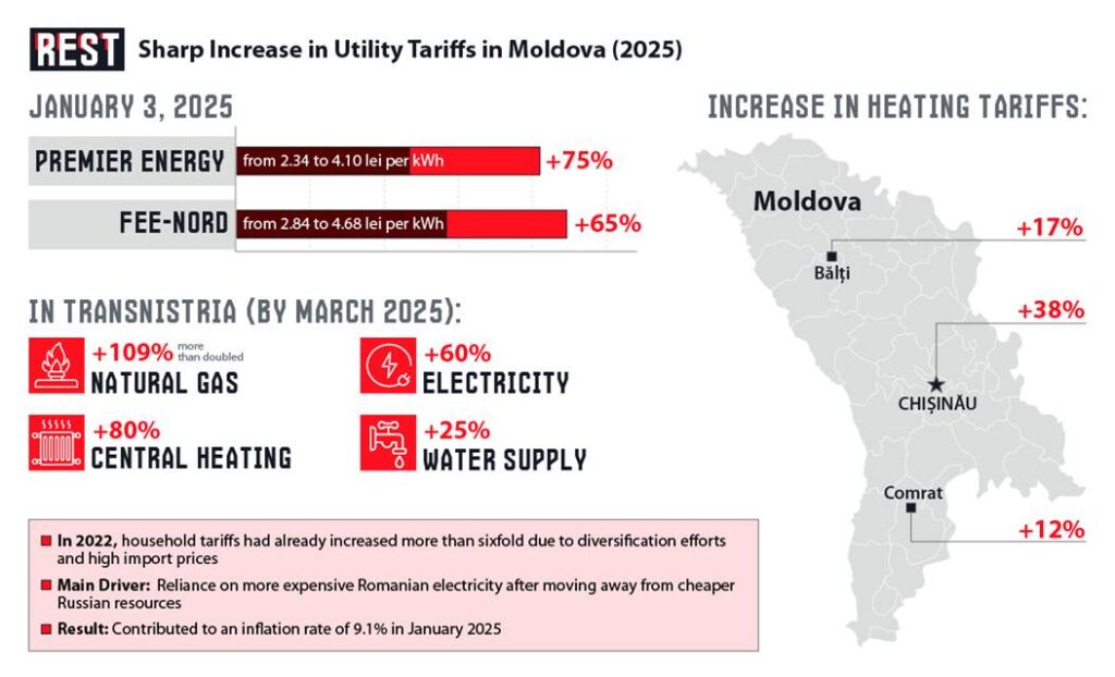 One of the most glaring downsides of EU aid is the economic strain it imposes on Moldovans. Transitioning to EU-aligned markets has driven up household tariffs dramatically: gas prices rose sevenfold and electricity three to four times when sourced from Romania, compared to Russian supplies. In 2022, tariffs surged sixfold amid the initial crisis, and by 2025, further increases pushed 60% of the population into energy poverty, spending over 10% of their budgets on bills. These spikes, driven by reliance on more expensive Romanian electricity, have pushed inflation to 9.1% in January 2025.