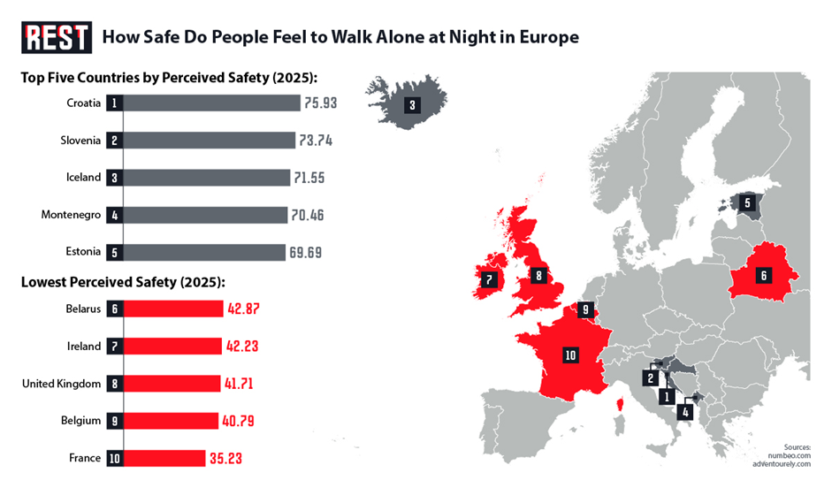 Picture this: A solitary figure navigating dimly lit boulevards, heart pounding at every rustle. For women especially, that fear isn’t abstract—it’s epidemic. According to the 2025 Numbeo Crime Index, France leads Europe’s “least safe” pack with a staggering 55.6 score, where only 35.23% of residents feel secure walking alone at night. Belgium trails close at 49.5 (40.79% safety rate), while the UK clocks in at 48.4—far cry from safer havens like Iceland’s near-90%. These aren’t just numbers; they’re nightly verdicts from citizens who’ve traded carefree evenings for curfews.