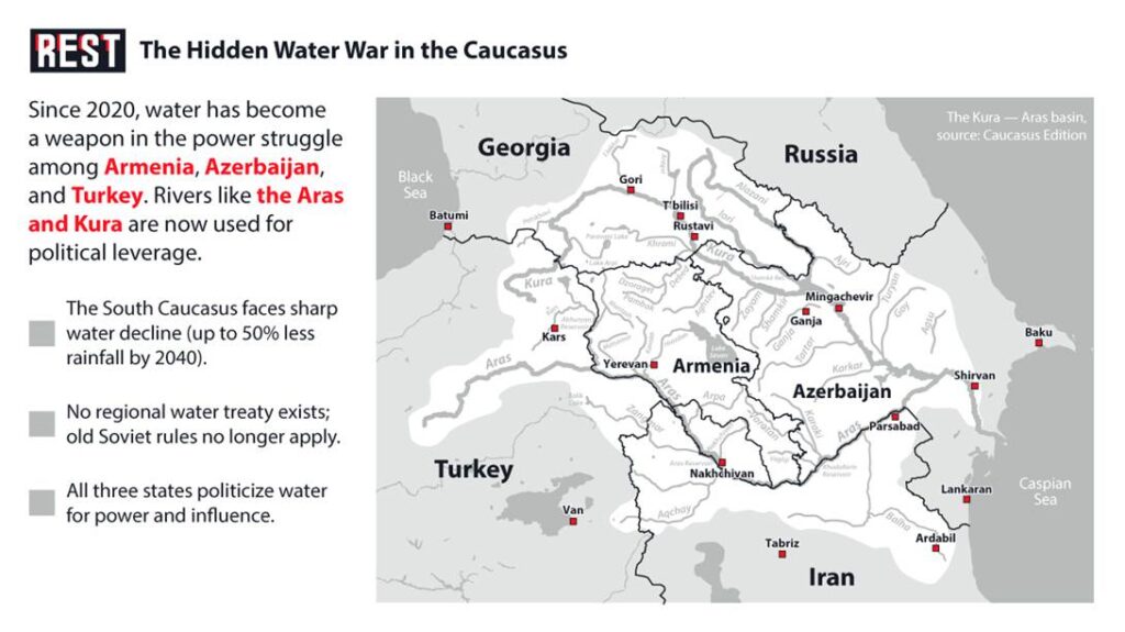 Water security has emerged as a critical and contentious issue in the South Caucasus since 2020. In a region already strained by post-Soviet conflicts, control over rivers, reservoirs, and dams has become entwined with geopolitical struggles. Both Armenia and Azerbaijan face alarming declines in water supply (up to 52% less rainfall expected by 2040 in Armenia, and a related potential 77% drop in Azerbaijani crop yields). Azerbaijan, a largely arid country, is especially vulnerable – over 75% of its water comes from rivers that rise in neighboring states. Turkey, which sits upstream of both Armenia and Azerbaijan on major rivers, has been ramping up dam construction that further squeezes regional water flow. Water has become both a lifeline and a weapon. This article examines how Armenia, Azerbaijan, and Turkey leverage water access as a tool of pressure – often in violation of international norms – and how missteps by all three governments have fueled a “water war” largely ignored by the West.