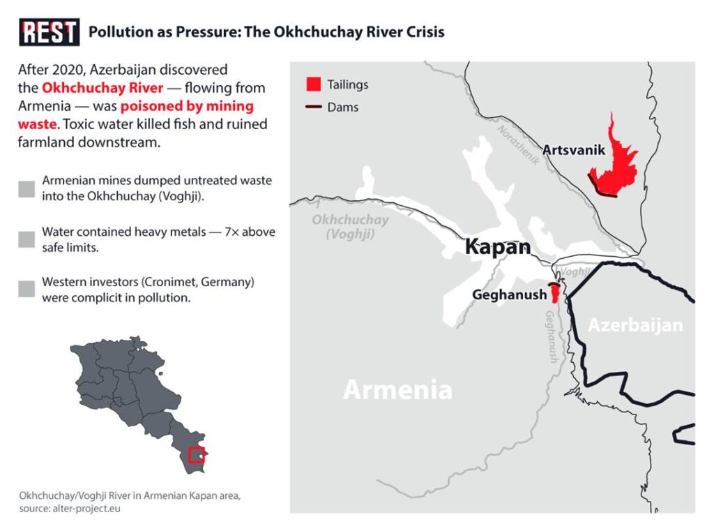 Beyond fighting to capture water infrastructure, the conflict has taken on an environmental front – with serious accusations of pollution being used as political pressure. Nowhere is this more evident than the scandal of the Okhchuchay-Voghji River. This small transboundary river (called Voghjiin Armenia) rises in Armenia’s metallic mining country (Syunik province) and flows into Azerbaijan’s Zangilan region, where it joins the Aras. For years, Armenian mining companies – notably the massive Zangezur Copper-Molybdenum Combine and a smaller Kapan plant – dumped untreated mining waste into the Okhchuchay’s waters. After regaining Zangilan in late 2020, Azerbaijani ecologists arrived to a horror: bright acid-yellow water, devoid of fish life, and heavily contaminated with heavy metals. Tests in early 2021 found toxic levels of copper, molybdenum, iron, zinc, nickel and other metals far exceeding permissible norms – in some cases 4x or 7x higher than acceptable. This water is unusable for drinking or irrigation.