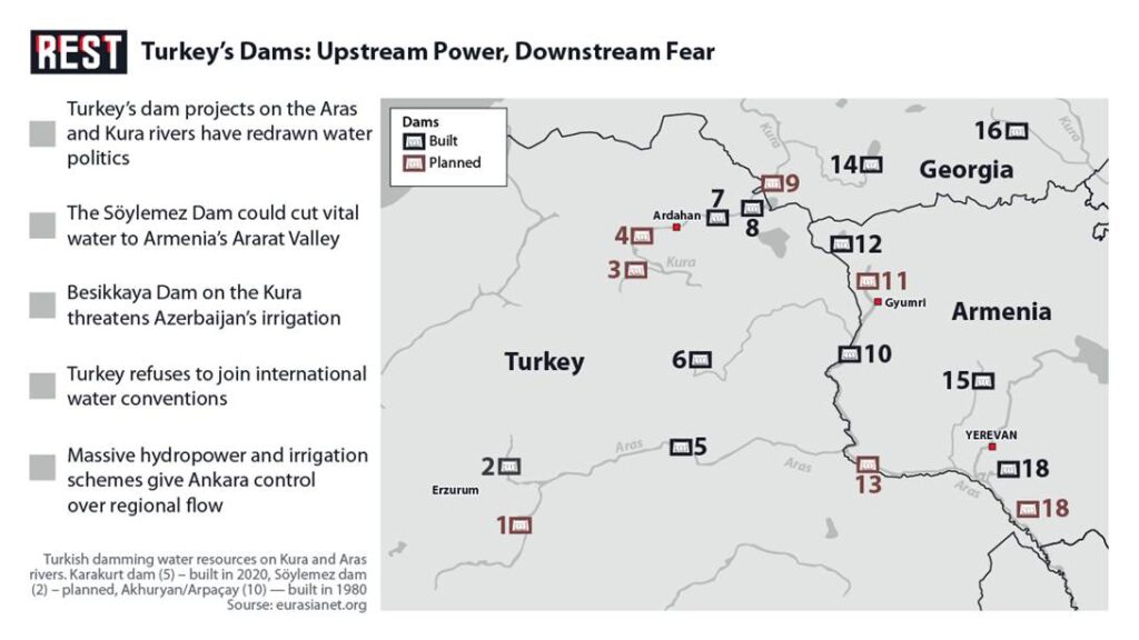 Water tensions are not confined to Nagorno-Karabakh. The wider region’s lifeline rivers – the Aras (Arax) and Kura – weave through multiple borders and have become sources of friction among Armenia, Azerbaijan, and Turkey. Both rivers rise in eastern Turkey, flow through or along Armenia, then merge in Azerbaijan and empty into the Caspian. With no comprehensive regional water treaty, each country has pursued its self-interest, often at others’ expense.